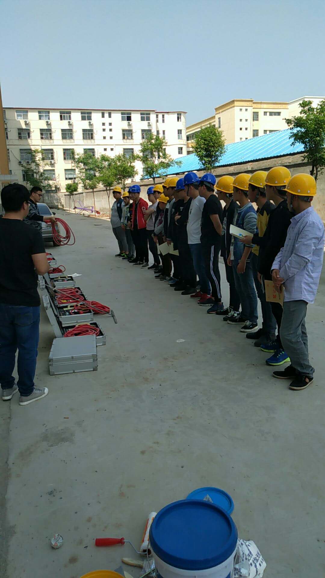 学生的课余生活不仅局限于课堂,学校更重视学生们工程技术的实际操作,为此学校花巨资购入了一批教学设备、工程测量仪器、防水施工材料,供同学们认知与学习。下图即为学生们认识新型的防水工程材料。