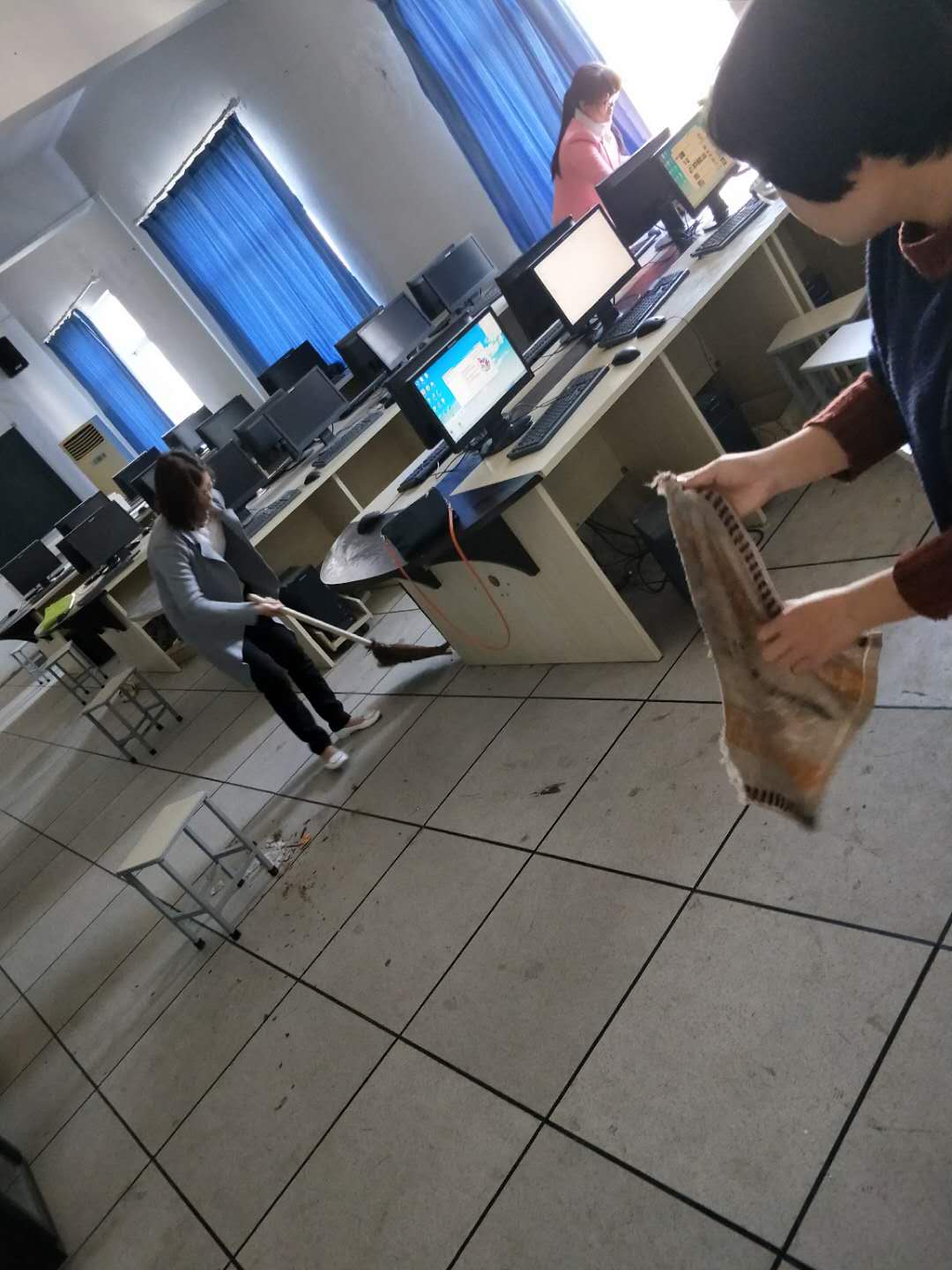 郭美麟等老师在打扫机房卫生