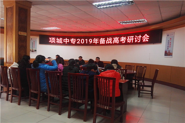 项城中专2019年备战高考研讨会,3月7日在办公楼二楼会议室召开。三年级全体任课教师参加了会议。会议由学校教务处张锦军校长和师群力主任主持。师主任总结开学以来学生的学习情况,指出在复习中存在的问题,并对问题做出了解决方案。各任课老师互相交流,总结经验,为学生下一步更好的学习出谋划策。