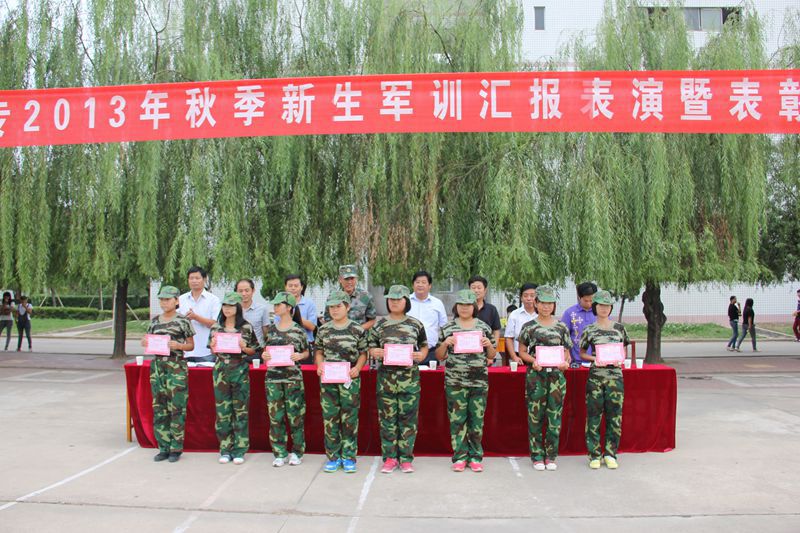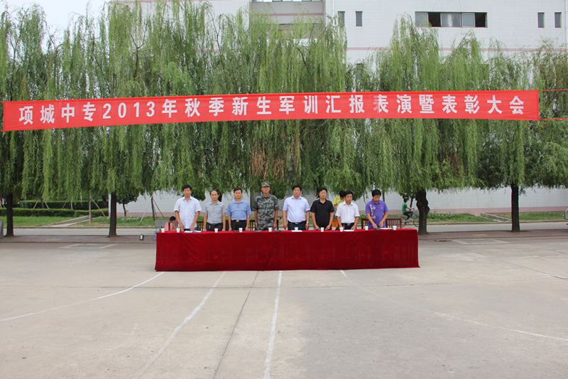 9月2日下午16:00时,我校2013年秋季新生军训汇报表演暨表彰大会在校篮球场举行。与会的领导有:高校长,主管师训工作的王校长,主管教务工作的张校长,主管政教、团委工作的付校长,主管招生、就业、电大、函授工作的陈校长,政教处张主任,周口军分区的教导队的师队长,大会由校团委书记汪长亮主持。全体新生向学校领导和周口军分区的教导队首长汇报展示了军训成果。