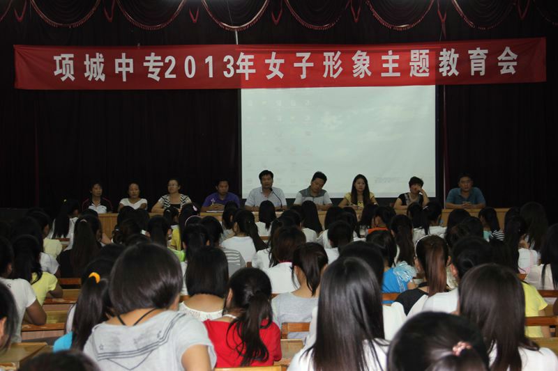 2013年8月29日晚上,项城中专在实训楼五楼召开了女生形象主题教育会,参加会议的领导有校团委书记汪长亮同志、服装专业部主任王赟同志、音幼专业部主任王炳琦同志和服装、音幼专业部的全体班主任,会议由政教处主任张成礼主持。
