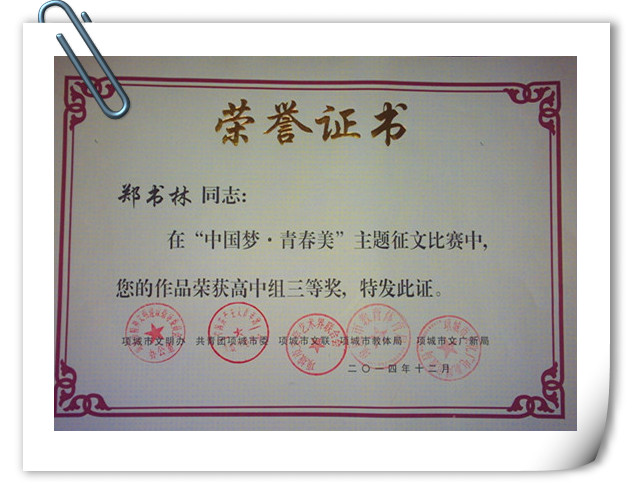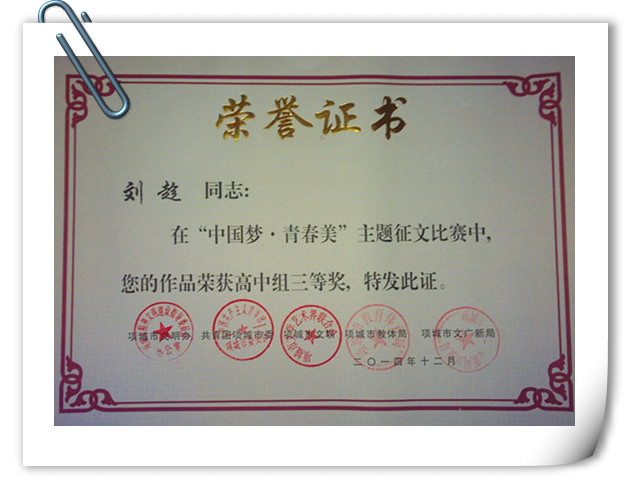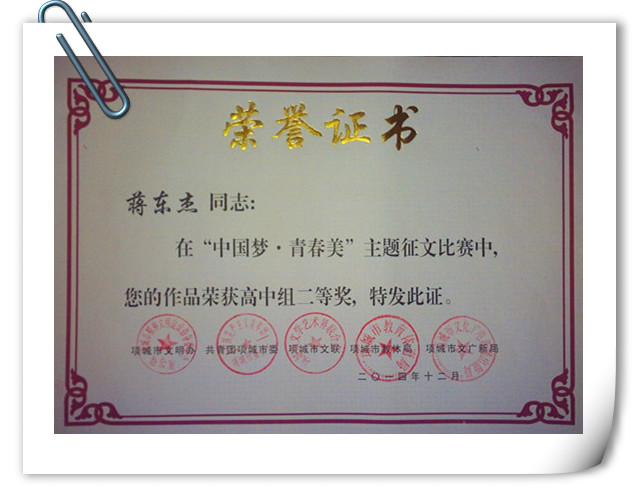“中国梦 青春美”征文活动开展以来,在各级各部门的大力支持下,比赛获得了全市中学和广大师生的积极响应,共收到参赛作品1000余篇。作品题材广泛,内容丰富,以“中国梦 青春美”为主题,多角度、全方位的展示了我市广大中学生积极向上、朝气蓬勃的精神面貌和奋发图强、建设六个项城的坚定信心。由项城市作家协会、项城市青年作家协会的相关专家组成的评审组,对稿件逐一评审,层层筛选,评选出初中组、高中组(含职专)优秀作品65篇。