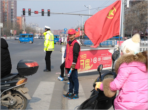 1月21日上午,来自我校各个班级的24名青年志愿者徒步到达本次活动的目的地——公安局北面的十字路口、项城三高的十字路口。我校青年志愿者们按照交警同志的指导,分散到各个路口协助指挥交通。