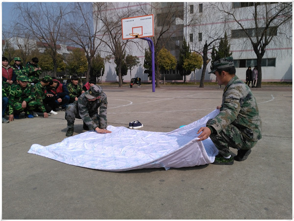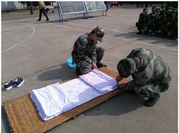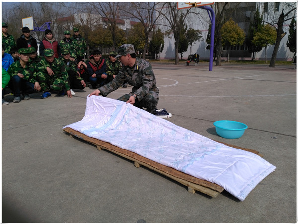 教官们首先深入各个宿舍,对学生宿舍内务整理的要求进行了详细说明,并重点从“甩被、摊平、分层、手砍、拉直、除皱”等几个方面对“豆腐块”的叠法向同学们进行了现场示范。同学们认真学习,并用手机录像来记录教官的叠被过程,以用于自己学习。接着,教官们耐心向同学们讲解了各类物品的整理方法及摆放要求并向同学们阐述了整理内务的重要性,希望大家认真进行内务整理。