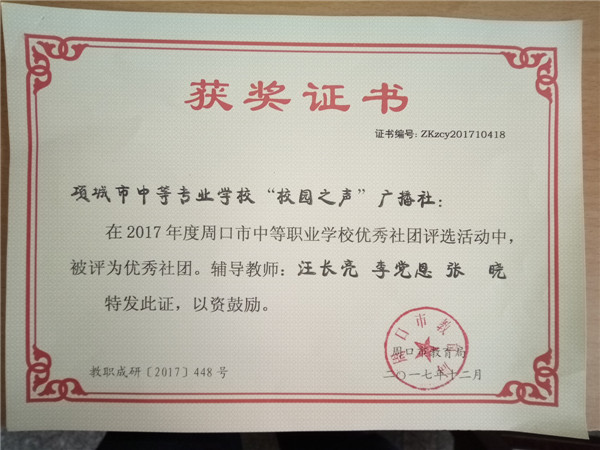 根据《周口市教育局关于开展2017年全市中职学校优秀社团评选活动的通知》文件精神,我校“校园之声”广播社积极参与此项工作的申请,严格按时文件规定内容进行组织准备工作,并经过学校的层层把关,最终我校广播社被评为周口市中职学校优秀社团。