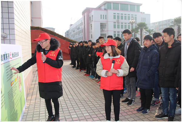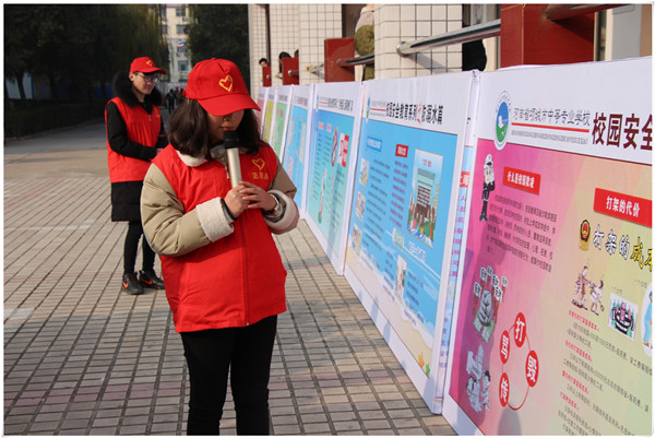 为了深入开展创建平安校园的宣传教育活动,全力维护教育稳定、校园稳定,发挥教育行业的精神文明窗口作用;进一步完善校园治安防控体系,强化安全责任意识;增强广大师生的安全意识,普及安全知识。决定开展“‘平安校园’志愿者安全知识宣传活动”。我校校团委、政教处从交通安全教育、食品安全教育、消防安全教育、防溺水安全教育、环境保护教育、防校园欺凌安全教育、吸烟有害健康安全教育、疾病预防安全教育8个方面,对全校6个专业的一千余名学生进行分批教育,从而提高安全意识,增强安全防患能力。