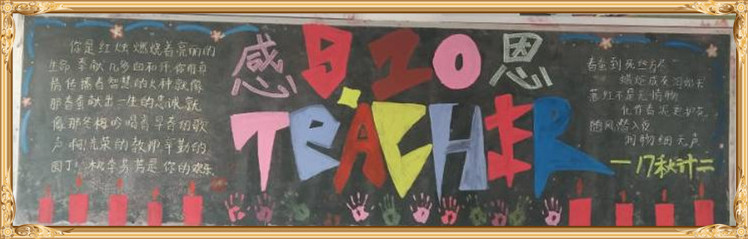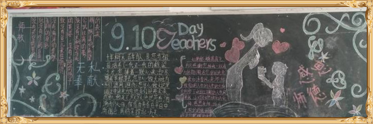 金秋九月,我们迎来了第34个教师节。习总书记在北京师范大学师生代表座谈时讲到:“教师是人类历史上最古老的职业之一,也是最伟大、最神圣的职业之一,自古以来,中华民族就有尊师重教的优良传统……”为了感恩教师的辛勤付出和无私奉献,我校学生用一幅幅“感恩教师节”黑板报表达了对教师的感恩之情。