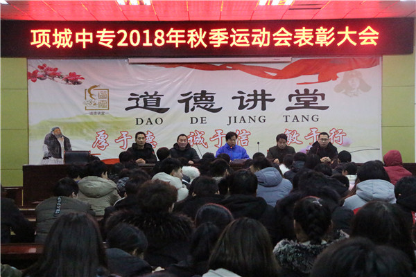 1月12日晩,项城中专的秋季运动会表彰大会在实训楼五楼举行,校团委书记汪长亮,机电专业部魏加力主任,汽修专业部刘永领主任,旅游专业部龙启冲主任,体育组张建主任出席了本次大会。大会对运动会期间取得优异成绩的运动员、班级进行了表彰。