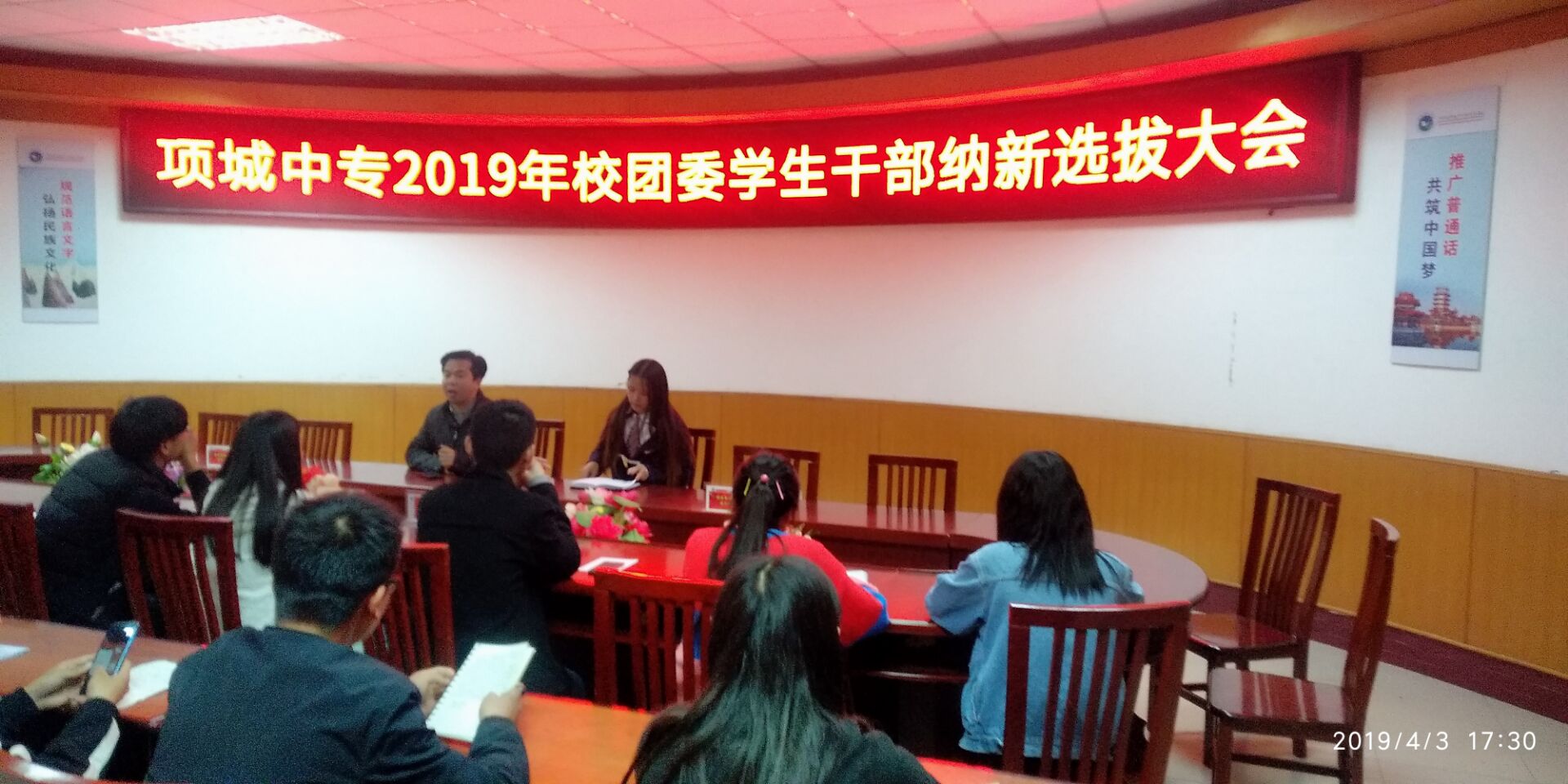 2019年4月3日下午5:10点,项城中专2019级校团委学生纳新选拔活动在办公楼二楼会议室举行。担任此次纳新选拔的评委有校团委团委书记汪长亮同志,学生副书记师晓晴及校团委所有学生干部。