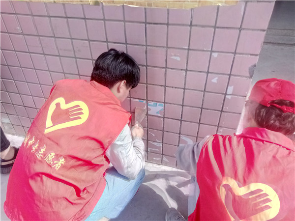活动现场,志愿者提着涂料桶,拿着铁刷、小铲,热火朝天地对小区、楼道、墙面、住户门上的每一块“牛皮癣”进行认真清理。