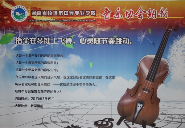 2013年3月15日,项城中专的文学社、书画协会、音乐协会、广播站、国旗护卫队和校园礼仪队在教学楼前进行了一期一度的纳新活动,本次活···