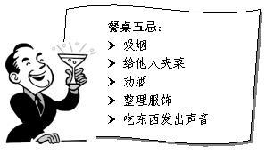 六、要适时地抽空和左右的人聊几句风趣的话,以调和气氛,不要光着头吃饭,不管别人,也不要狼吞虎咽地大吃一顿,更不要贪杯。